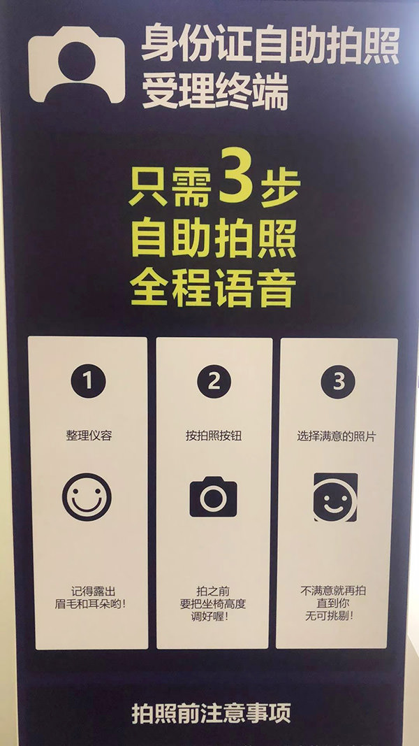 身份证自助拍照一体机集合了自助拍照和自助办证两大模块,支持居民身份证的到期更换和丢失补办,全程语音提示,办证人可自行按照屏幕和语音提示,按照选择业务类型、身份证号码认证、指纹认证、拍摄照片、采集指纹、输入手机号码、支付办证费用、打印申领登记表的流程进行操作,拍照部分实现“多拍优选”,直到拍出自己满意的照片,设备的安全性也进行了加强,采用了人脸识别、指纹比对等科技手段,自动与人口信息进行比对,最大限度杜绝假冒身份办理身份证的情况。